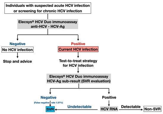 Given the high prevalence of HCV infection in some populations, such as people who inject drugs, men who have sex with men, and prisoners, it is essential to distinguish active HCV infection from past exposure with viral clearance. For instance, a recent meta-analysis has demonstrated a high prevalence of anti-HCV positivity (17.7%) in prisoners worldwide, ranging between 10 and 30% over five continents [24]. Thus, simplified testing strategies are necessary among these high-risk groups to enhance treatment uptake for HCV eradication and prevent further transmission to the general population [27,28,29]. In this regard, the Elecsys® HCV Duo immunoassay is a simple and affordable assay to identify individuals with chronic HCV infection as a single-step test that could lead to improved linkage to care and treatment uptake (Figure 1), particularly in resource-limited settings with high HCV prevalence and transmission potential.