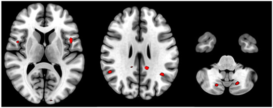 Results of between-group analysis. Clusters of greater activation in patients’ group are shown in red.