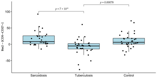 Note that Bm2 and CD5−CD27− are two of the few cell types for which the respective concentrations do not differ significantly between groups (p = 0.98 for Bm2 and p = 0.34 for CD5−CD27−). However, it is shown below that the difference in the concentrations of these two cell types differs between the sarcoidosis and tuberculosis groups more significantly than the concentration of any individual cell type considered in this study (Table 4).