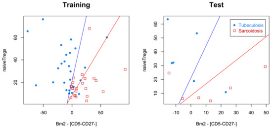To build and validate the classification model and the algorithm based on it, the data on the groups of patients with sarcoidosis and tuberculosis were divided into training and test samples: sarcoidosis (n = 6) and tuberculosis (n = 6) patients were randomly selected for the test sample, while the remaining 23 patients with sarcoidosis and 25 patients with tuberculosis patients constituted the training sample. Symbolic regression [23,24] was then applied to the training sample to search for expressions of arbitrary form whose positivity best agrees with sarcoidosis (and negativity with tuberculosis). In some of the resulting expressions, a combined feature Bm2 − [CD5−CD27−] appeared.
