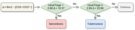 Despite the achievements of modern medicine, tuberculosis remains one of the leading causes of mortality globally. The difficulties in differential diagnosis have particular relevance in the case of suspicion of tuberculosis with other granulomatous diseases. The most similar clinical and radiologic changes are sarcoidosis. The aim of this study is to apply mathematical modeling to determine diagnostically significant immunological parameters and an algorithm for the differential diagnosis of tuberculosis and sarcoidosis. Materials and methods: The serum samples of patients with sarcoidosis (SD) (n = 29), patients with pulmonary tuberculosis (TB) (n = 32) and the control group (n = 31) (healthy subjects) collected from 2017 to 2022 (the average age 43.4 ± 5.3 years) were examined. Circulating ‘polarized’ T-helper cell subsets were analyzed by multicolor flow cytometry. A symbolic regression method was used to find general mathematical relations between cell concentrations and diagnosis. The parameters of the selected model were finally fitted through multi-objective optimization applied to two conflicting indices: sensitivity to sarcoidosis and sensitivity to tuberculosis. Results: The difference in Bm2 and CD5−CD27− concentrations was found to be more significant for the differential diagnosis of sarcoidosis and tuberculosis than any individual concentrations: the combined feature Bm2 − [CD5−CD27−] differentiates sarcoidosis and tuberculosis with p < 0.00001 and AUC = 0.823. An algorithm for differential diagnosis was developed. It is based on the linear model with two variables: the first variable is the difference Bm2 − [CD5−CD27−] mentioned above, and the second is the naïve-Tregs concentration. The algorithm uses the model twice and returns “dubious” in 26.7% of cases for patients with sarcoidosis and in 16.1% of cases for patients with tuberculosis. For the remaining patients with one of these two diagnoses, its sensitivity to sarcoidosis is 90.5%, and its sensitivity to tuberculosis is 88.5%. Conclusions: A simple algorithm was developed that can distinguish, by certain immunological features, the cases in which sarcoidosis is likely to be present instead of tuberculosis. Such cases may be further investigated to rule out tuberculosis conclusively. The mathematical model underlying the algorithm is based on the analysis of “naive” T-regulatory cells and “naive” B-cells. This may be a promising approach for differential diagnosis between pulmonary sarcoidosis and pulmonary tuberculosis. The findings may be useful in the absence of clear differential diagnostic criteria between pulmonary tuberculosis and sarcoidosis.