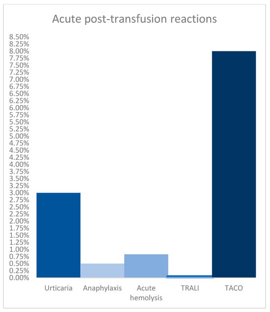 Prevalence of the most common acute post-transfusion reactions: urticaria and angioedema 1–3%, anaphylaxis 1 per 20,000 cases, acute hemolytic transfusion reaction 1 per 12,000 cases, TRALI 1 per 480,000 cases, and TACO 8% [].