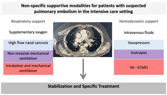 There are different non-specific modalities that can be used in the intensive care setting to support patients with pulmonary embolism with respiratory and hemodynamic compromise.