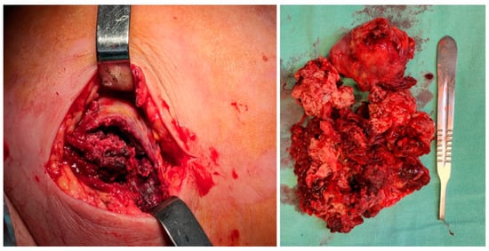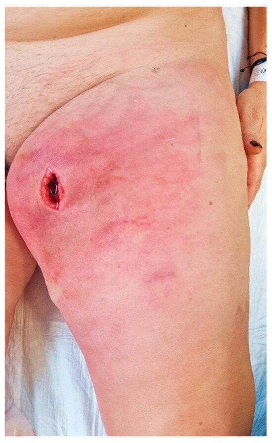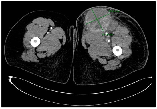 Upon admission to our emergency department, the patient had a high fever (39.3 °C), was shivering, and had tachycardia (120 bpm). At the clinical examination, she presented redness, swelling, and heat of the left thigh with an onset of 3 days prior, and a skin incision of approximately 3 cm, revealing a deep mass (Figure 1). A palpation showed in the anteromedial upper thigh an imprecisely delineated tumor, approximately 10/7 cm in size, adherent to the deep and superficial planes, associated with left inguinal lymphadenopathy, with palpable superficial nodes of 1–2 cm in diameter. Her past medical history was non-significant. The patient said she observed a slow-growing mass, progressively increasing for the past six months, after repeated minor trauma.