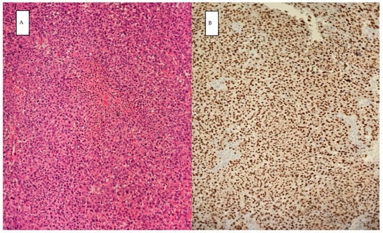 Histopathology: showing samples stained with hematoxylin and eosin under magnification of 20× (A), positive immunostaining for SOX10 (B) consistent with malignant melanoma.