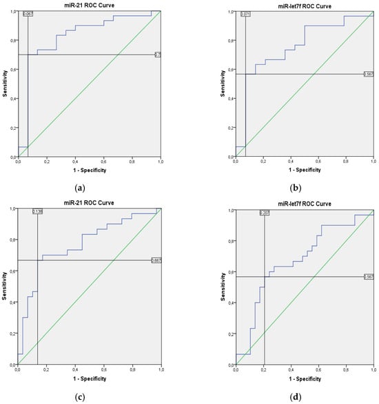ROC curves. The cut-off values for miR-21 and miR-let7f that can be used to differentiate (a) Group 1 (>50% NEFs) from Group 3 (IDC): as regards the identified cut-off values, miRNA-21 was found to have 70% sensitivity and 93.3% specificity between Group 1 and Group 3 cases; (b) Group 2 (10–50% NEFs) from Group 3 (IDC): miR-let7f was observed to have 56.7% sensitivity and 92.9% specificity for this identified cut-off value; (c,d) BC with NEFs from Group 3 (IDC): miR-21 was found to have 66.7% sensitivity and 86.2% specificity between NEBC and IDC cases while miR-let7f was found to have 56.7% sensitivity and 79.3% specificity for identified cut-off values. Blue: ROC curve; Green: Reference line; Black: Reflections of cut-point on x and y lines.