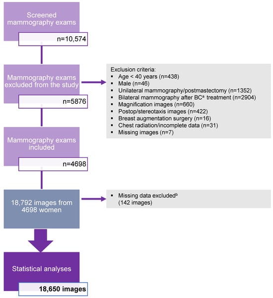 Study population flowchart illustrating the specific criteria for exclusion in the study. A total of 4698 mammography exams were included in the study. a BC = breast cancer. b Missing data excluded = breast density score not generated by the software.