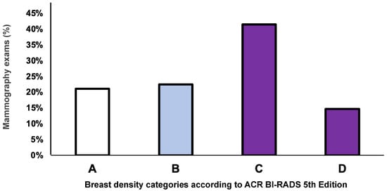 Among all mammography exams, the highest prevalence was observed for category C—heterogeneously dense (41.5%) followed by category B—scattered areas of fibroglandular tissue (22.5%), category A—almost entirely fatty (21.2%), and category D—extremely dense (14.7%). For the overall cohort, 56% of all mammograms analyzed were categorized as dense breasts, which includes categories C (heterogeneously dense) and D (extremely dense) combined, as shown in Figure 2.
