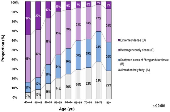 It is challenging to compare the prevalence of breast density found in our study with the prevalence reported in the literature because of the diversity of breast density assessment methods and different populations. Our study estimated the prevalence of breast density comparable to the prevalence reported by few studies conducted in local populations in Asia [23,31]. Jo at al., using the BI-RADS 4th Edition, reported that more than half of Korean women aged 40 years and older presented dense breasts [31]. Youn et al., by analyzing breast density in Korean women by fully automated volumetric assessment, showed an 83.2% rate of dense breasts among women who participated in the national screening program [23]. Considering both breast density and age, the distributions of the dense and nondense categories reported in our study confirm a progressive decrease in breast density with age, which is consistent with the current literature [22,28,31].