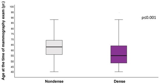 The results of the quantitative analysis of the age distributions in relation to the dichotomous categories of breast density (categories dense and nondense) are presented. The data indicate that women with dense breasts (categories C and D, combined) are, on average, younger (57 years ± 11 years) than women with nondense breasts (categories A and B, combined), whose average age was 63 years ± 9 years (p < 0.001). These results demonstrate that age and breast density are closely related, with younger women tending to have denser breast tissue. The results are presented in Figure 4.