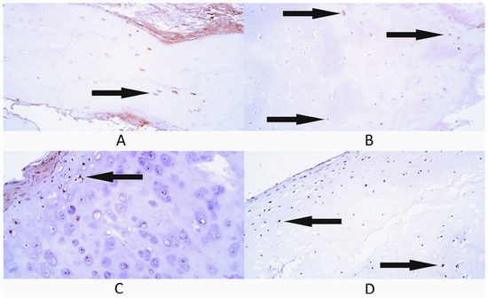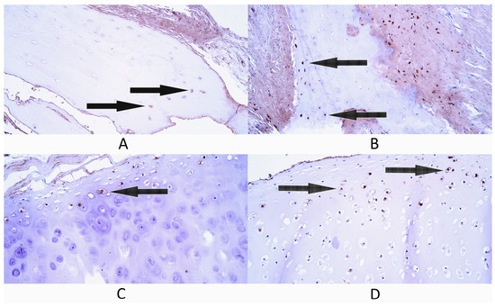 In the cartilage tissue control group, there were a few to moderate (+/++) number of HSP60-positive chondrocytes as the median number (Figure 4C). Three patients had few to moderate (+/++) HSP60-containing cells, one patient had a moderate (++) number and another patient had moderate to numerous (++/+++) HSP60-positive cells.