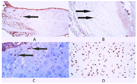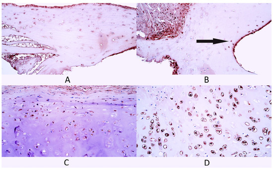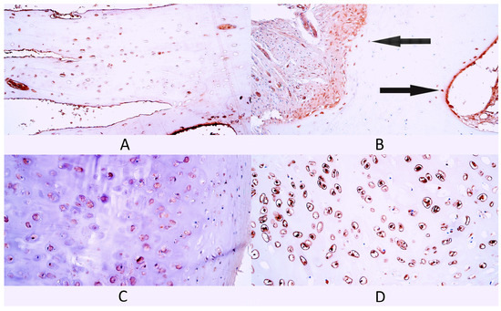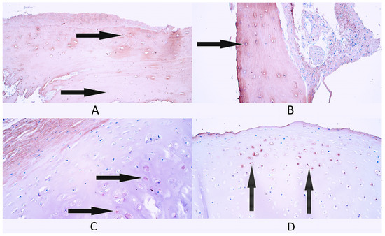 In general, there was a rare occurrence (0/+) of Col-I-positive cartilage cells in the cleft-affected cartilage group. A rare occurrence (0/+) of Col-I-positive cartilage cells was seen in three patients, one patient had a few (+) positive cells and one patient had a few to moderate (+/++) positive chondrocytes (Figure 7D).