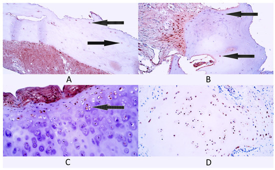 Samples of supportive tissue (bone and cartilage) were prepared for immunohistochemical investigation and light microscopy by employing standard streptavidin and biotin immunostaining methods [57] to identify immunopositive cells within bone and cartilage tissue of patients and controls. Immunohistochemistry with different antibodies was performed in accordance with the technical specifications given by antibody manufacturers. The following antibodies were used for the identification of factor-positive bone and cartilage cells: Gal-10 antibodies (orb157023, rabbit, polyclonal, dilution 1:200, Biorbyt Ltd., Cambridge, UK); NF-κB p65 antibodies (orb37069, rabbit, polyclonal, dilution 1:100, Biorbyt Ltd., Cambridge, UK); HSP60 antibodies (sc-1052, goat, polyclonal, dilution 1:100, Santa Cruz Biotechnology, Inc., Dallas, TX, USA); HSP70 antibodies (33-3800, mouse, monoclonal (MB-H1), dilution 1:100, Invitrogen, Waltham, MA, USA); LL-37 antibodies (sc-166770, mouse, monoclonal (D-5), dilution 1:100, Santa Cruz Biotechnology, Inc., Dallas, TX, USA); Col-I antibodies (NB600-408, rabbit, polyclonal, dilution 1:100, Novus Biologicals, LLC, Centennial, CO, USA); and BMP-2/4 antibodies (AF355, goat, polyclonal, dilution 1:100, R&D Systems, Inc., Minneapolis, MN, USA).