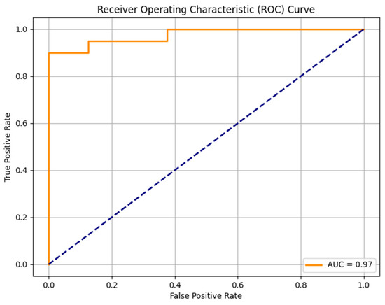 The random forest model was trained on 111 sarcomas and tested in a set with 28 sarcomas. The model identified the most important features indicating the malignancy grades of sarcomas: intensity quartile coefficient dispersion of contrast-enhanced T1w images (feature importance 0.0357), peritumoral edema (feature importance 0.0298), heterogeneity in T2w images (feature importance 0.0247), intensity quartile coefficient dispersion in T2w images (0.0156) and histogram uniformity in T2w images (0.0133). The trained model was able to predict high-grade status in sarcomas with an AUC-ROC Score of 0.97, an F1 Score of 0.93, an accuracy of 0.89, a sensitivity of 100%, and a specificity of 62.50% (Figure 2).