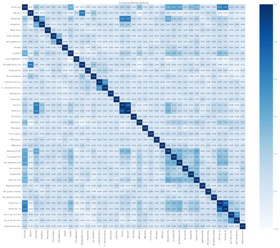 In order to improve the quality and relevance of the data, a correlation analysis is achieved on the PCOS diagnosis dataset. This analysis aims to find columns with poor relationships with other variables of the dataset. Accordingly, a correlation analysis is executed using the Pearson correlation coefficient among different variables of the dataset. The heatmap, showing the underlying correlations, is shown in Figure 1. Columns having a correlation value below 0.1 were eliminated since they had little effect on the data. Hence, all columns with a correlation equal to or higher than 0.1 and up to 1.0 are taken into consideration. After removing such columns, the dataset was found to have 35 columns. This is a widely used procedure in feature selection. Notably, removing features with a low association with the target variable or other attributes streamlines the dataset for accurate modeling. The correlation value of 0.1 is conservatively selected to exclude only features with a weak association. This reduces the dataset and may make PCOS diagnosis without infertility more predictive. An example correlation analysis with a threshold of 0.25 is depicted through the heatmap shown in Figure 2.
