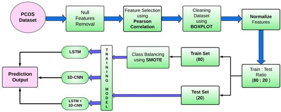 The remaining portion of our research study is as follows: An associated review of the literature on PCOS is included in Section 2 of this paper. In Section 3, the preliminary details of the CNN, LSTM, and SMOTE are presented. The proposed methodology is discussed in Section 4. A performance evaluation of the proposed models designed in this paper for PCOS is conducted in Section 5. Lastly, we conclude our study in Section 6.