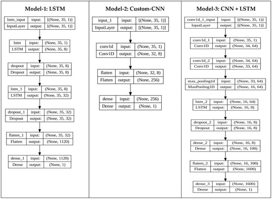 Typical architectures of the three proposed deep learning models with the size of input and output of each layer.