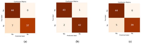 The performance results obtained for the given setting are recorded and presented in Table 4. The table shows tests for various parameters like accuracy, precision, recall, F1-score and the AUC. An analysis of the parameters with the help of plots and confusion matrices is also presented. The confusion matrices of each model are shown separately, which gives the idea of the true positives identified. Plots of accuracy and loss against the number of epochs are also plotted, for both the train and test data. The confusion matrices for all three suggested models are shown in Figure 5. The accuracy measures obtained for the proposed three models for PCOS prediction are 92.04%, 96.59%, and 94.31%, respectively. In our model, recall represents the proportion of correctly identified patients out of all of the patients obtained. The peak recall achieved by model-1 is 92.04%, for model-2, it is 96.59%, and for model-3, it is 94.31%, respectively. Precision represents the proportion of accurately identified patients with PCOS out of all of the individuals identified as patients. The precision values for the three models are 93.13%, 96.60%, and 94.89%, respectively. Precision provides a count of the relevant data points and aids in evaluating the model’s accuracy. Figure 5 shows that model SMOTE + CNN gives the best results of all. In addition, it is evident from the confusion matrix that the precision, recall, F1-score, and AUC also show the best scores for this model. The stack of SMOTE and CNN performs best for all the given parameters. A one-dimensional CNN is used in order to extract features. Model-3 (SMOTE + CNN + LSTM) also performs well but slightly less well than the previous stack. The model SMOTE + LSTM shows the least convergence of all three. The reason behind the CNN performing better than the other two models is that CNNs are naturally spatial feature-extracting bodies. Conversely, LSTM is capable of catching temporal dependencies. The stack CNN + LSTM shows good results but inserts temporal dependency on top of spatial dependency. This adds another level of complexity on top of the CNN. Thus, the CNN outperforms the CNN + LSTM stack.