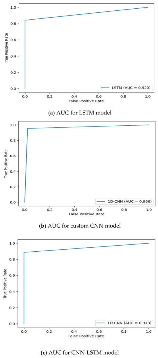 The plots in Figure 6, Figure 7 and Figure 8 show the progressive convergence of the models with respect to epochs. The plots of accuracy vs. epochs show the best result for the SMOTE + CNN model; the model has low variance. The training and testing curves for this model have a smaller gap between them. The other models show noticeable variance between the training and testing data. The best accuracy of 96.59% was achieved using the SMOTE + CNN model and the other two models showed a slight lower side in the accuracy score. The behavior of loss incurred vs. epochs is also shown in Figure 5, Figure 6 and Figure 7. The training loss for the SMOTE + LSTM model converges abruptly, whereas the testing loss shows little convergence. The SMOTE + CNN model gives the best convergence among all, with less variation and low bias. The test set loss does not vary from the training set loss in this model. The stack of SMOTE + CNN + LSTM also shows visible variance when subjected to the training and testing set. The AUC behavior of the anticipated algorithm is depicted in Figure 9. The AUC obtained by model-1 is 92.0%, for model-2, it is 96.60%, and for model-3, it is 94.3%, respectively. The plots give an overview of the AUCs for all three models; all three models perform well regarding this objective. Again, the SMOTE + CNN model outperforms all the others, with a peak score of 96.59%. Thus, we can conclude that, given the results and after conducting various analyses, model-2, SMOTE + CNN, outperforms the other two models.
