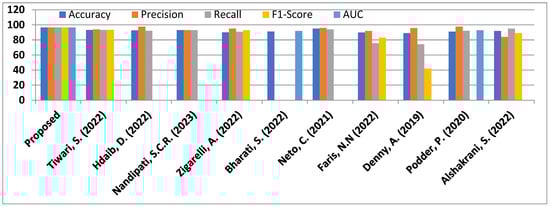 A fair comparison of performance on the same dataset is necessary to judge the efficacy of the suggested model. This section aims to present a comparison analysis with some existing and recent PCOS detection models. Table 2 shows the PCOS detection ability of different models, which are obtained on the same Kaggle dataset [] and performance is compared in terms of the standard performance metrics discussed earlier. Ref. [] developed an SPOSDS, which is a smart diagnostic system for PCOS, by comparing the performance of many machine learning classifiers. The best accuracy of 93.25 has been presented by the SPOSDS system with the help of random forest (RF), using sqrt as the maximum feature hypermeter. Recently, Hdaib et al. in [] also investigated different machine learning classifiers to have an effective solution for good PCOS detection. They were able to achieve an accuracy of 92.6% and precision of 97.6% using the linear discriminant analysis (LDA) technique. In Ref. [], the authors analyzed a number of ML approaches to solve the accurate PCOS detection problem. Techniques such as KNN, SVM, RF, naïve Bayes, a neural network, bagging, and Adaboost were examined. The best performance (accuracy = 93.12%, precision = 93.12, and recall = 93.12%) were obtained for the random forest classifier with 40 features. Zigarelli et al. suggested a self-diagnostic model for PCOS in ref. [], which provided an accuracy of 90.1% and precision of 95% among different scenarios of analyses. However, a different set of ensemble classifiers were studied such as voting hard, voting soft, and CatBoost in ref. []. The investigation and analysis found that the highest accuracy of 91.12% was achieved using voting soft for predicting patients with PCOS. Neto et al. in [] examined various classifiers with the CRISP-DM model to predict PCOS. Their study reported the best classification performance through random forest and a data sampling technique, with an accuracy of 95%, precision of 96%, and recall of 94%. Recently, a genetic algorithm-based SVM method was suggested for PCOS classification in []. The performance results were not very convincing. Ref. [] also reported a PCOS detection and prediction study using different machine learning classifiers. A low accuracy of 89.02% was achieved with a precision of 95.83%. In Ref. [], the authors recommended a technique based on a hybrid of random forest and linear regression (RFLR), which was able to offer an accuracy of 91.01%, precision of 97.6%, recall of 92.2%, and area under the curve of 92.9%. In Ref. [], a number of ensemble models such as HRFLR, extreme boosting with RF, linear SVM, light gradient boosting, and CatBoost were investigated for identifying PCOS. The analyses showed that CatBoost performed best among all of the ensemble models and provided an accuracy of 92% and recall of 95% but had a precision of 84% only. However, our proposed model-2, which is based on a lightweight 1D CNN, is able to predict PCOS in much better way as it offers an accuracy = 96.59%, precision = 96.60%, recall = 96.59%, F1-score = 96.59%, and AUC = 96.60%. A summary of the comparison study in terms of performance results such as accuracy, precision, recall, F1-score, the area under the curve (AUC) is presented in Table 7. The overall prediction performance of our proposed deep learning model is sufficiently more enhanced than all of the PCOS models listed in Table 7. The performance comparison is also graphically presented in Figure 10. Hence, the comparison analysis validates the better performance of the proposed model over many recent PCOS prediction and detection models.