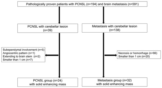 From May 2004 to December 2022, we conducted a retrospective review of medical records and preoperative MR imaging for patients with pathologically confirmed PCNSL and brain metastasis. These patients had undergone brain surgery or biopsy. Figure 1 presents a flowchart of patient inclusion and exclusion. Of the 194 patients with PCNSL, 39 had cerebellar lesions. We excluded those with specific cerebellar lesions: subependymal involvement (n = 5), angiocentric pattern (n = 1), brain stem lesion extending to the middle cerebellar peduncle (n = 2), and lesions smaller than 1 cm (n = 7). In the group of 591 patients with brain metastasis, 138 had cerebellar masses. From this group, we excluded patients with cerebellar metastatic lesions containing necrotic/hemorrhagic components (n = 86) and lesions smaller than 1 cm (n = 20). After reviewing MR images, we enrolled 24 patients with PCNSL and 32 with metastasis in the study. We collected clinical data from these 56 patients, including age, sex, immune status, underlying malignancy at the time of surgery, surgical method for specimen sampling, and history of lymphoma at least 6 months before surgery. The institutional ethics committee approved the study and waived the requirement for informed consent due to its retrospective nature.