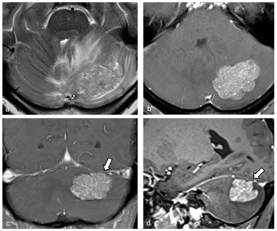 Images from a 55-year-old female patient with brain metastasis of breast cancer. An axial T2-weighted image (a) shows peritumoral streak edema in both cerebellar hemispheres. Contrast-enhanced T1-weighted axial (b), coronal (c), and sagittal (d) images display a non-necrotic, heterogeneously enhancing mass with a bulging contour and surface involvement (arrows).