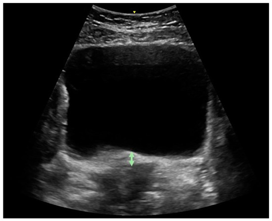 In all positions, the ultrasound transducer was placed in the transverse plane immediately supra-pubically over the lower abdomen at a 15–30° angle from the horizontal plane. The bladder base was marked with the online caliper tool of the device [23,24]. Participants were directed to perform a pelvic floor muscle contraction and the examiner assessed if a correct contraction (upward displacement of the bladder base) was performed, and then measured bladder base displacement (in mm) (Figure 1). In each position, two contractions were maximum voluntary contractions, and the third contraction examined endurance. The participant was instructed to hold the contraction as long as she could (measured in sec). If the contraction exceeded 30 s, she was instructed to stop.