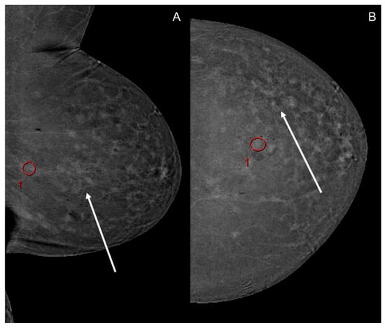 Example of qualitative BPE measurement using an oval-shaped ROI (red circles with numbering illustrating the number of ROIs within the image) in CESM images of the left breast of a 75-year-old woman in a mediolateral oblique (A) and craniocaudal projection (B). The contrast uptake of the histologically confirmed invasive carcinoma (arrows) can hardly be detected due to an extensive background enhancement.