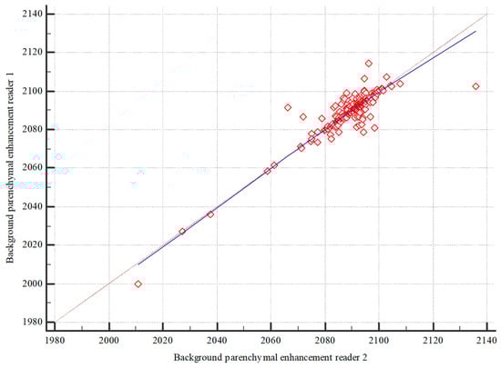 The inter-reader reliability for the quantitative assessment of BPE demonstrated a strong correlation, with a Spearman’s correlation coefficient (ρ) of 0.804, as depicted in Figure 2. Similarly, the qualitative assessment showed a high intraclass correlation (ρ = 0.766). The first reader’s results are illustrated in Figure 3.