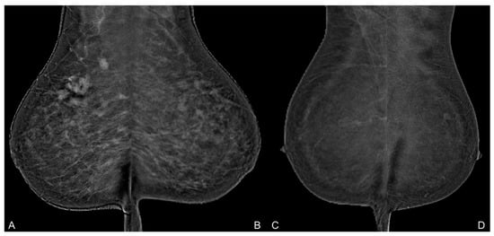 Contrast-enhanced spectral mammography (CESM) was first introduced in the early 2000s. Therefore, it is a relatively recent advancement in breast imaging. It is an alternative to breast MRI and is particularly beneficial for patients with dense breast tissue, offering enhanced sensitivity compared to conventional mammography and ultrasound alone [1,2]. Since its introduction to the market, numerous studies have assessed the diagnostic accuracy of CESM, demonstrating a high sensitivity of approximately 90% and a commendable specificity of around 85% [3,4,5]. Before the examination, an iodine-based contrast agent is applied intravenously (1.5 mL/kg body weight). With a mammography device, two images are acquired during one round of compression—one image at a low energy level (26–33 kVp), and one at a high energy level (44–50 kVp). The low-energy image resembles a conventional digital mammogram. Using a complex recombination process with weighted logarithmic subtraction, a recombined image is produced, highlighting areas of increased contrast uptake. Pathological findings typically exhibit some degree of iodine uptake on CESM due to their neoangiogenesis [6,7,8].