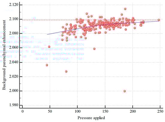 The analysis revealed a significant (p < 0.001) and moderate (Spearman’s ρ = 0.546) correlation between applied pressure during CESM imaging and quantitative BPE, suggesting an approximately linear relationship (Figure 5). The correlation between applied pressure and qualitative BPE was also statistically significant (p < 0.001) but weaker (Pearson’s ρ = 0.273).