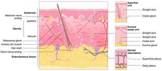 - Kolarsick, P.A.; Kolarsick, M.A.; Goodwin, C. Anatomy and physiology of the skin. J. Dermatol. Nurses’ Assoc. 2011, 3, 203–213. [Google Scholar] [CrossRef]