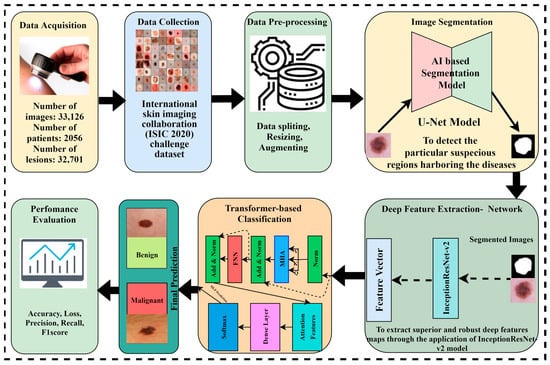 The proposed methodology is based on four major phases. Initially, the dataset was collected from the International Skin Imaging Collaboration (ISIC) and preprocessing techniques were performed on the data. The image segmentation is performed through the U-Net model to obtain targeted segmented masks and to avoid false detections by isolating the relevant areas for analysis. Afterward, the segmented masks and original images are given to the Inception-Resnet-v2 model for optimal extraction of features because Inception-Resnet-v2 has learned rich feature representations for a wide range of images. In the pipeline of the proposed framework, it is important to note that the output feature maps of Inception-Resnet-v2 are flattened to a sequence of patches and become the input of the Vision Transformer, where the self-attention mechanism refines the features to a spatial relationship, and after this transformation, a classification head is applied to receive the desired outcome. The Vision Transformer model with a self-attention mechanism is applied to perform the critical task of skin cancer classification in terms of malignant and benign lesions. Figure 3 depicts the novel proposed framework for skin lesion segmentation, extraction, and classification.