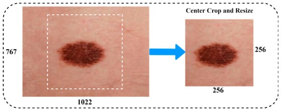 The aim of this step is to improve image quality by deleting irrelevant parts from the dermatoscopy images before they are processed further. Filters were utilized in the preprocessing of the data to reduce noise and increase the efficiency of the individual components. The procedure for processing the skin lesion image primarily consisted of two stages. Figure 4 illustrates an example of a dermoscopy image after being resized. Data augmentation is commonly used to improve the performance of the classification task on medical image datasets. Data augmentation techniques included a vast range of arbitrary transformations that included horizontal and vertical inversions, scale transformation, rotation transformation, zoom magnification, and brightness to augment the data for training, and almost generated 6562 images to balance the class of malignant scans. The details of the image augmentation methods with settings are as follows: scale transformation with ranges (zero to one), rotation transformation of 25 degrees, zoom magnification of 0.20, horizontal and vertical inversions with true, and arbitrary transformation of 20 degrees. Furthermore, the preprocessing techniques, i.e., centering and resizing the input images, have been utilized to achieve a newly generated image from the original image in the dataset.
