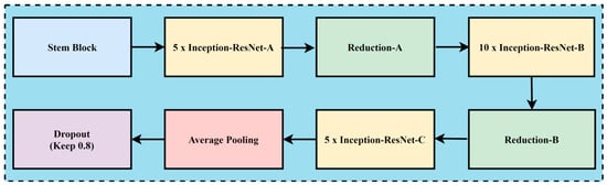 In the case of melanoma prediction through dermoscopic images, the combination of residual connections with Inception-v2 helps to enhance accuracy, better feature retention, enhance generalization with faster training, and reduce diagnostic errors, while without residual connections, the framework might lead towards misdiagnoses due to the complexity of melanoma prediction. The convolution neural network architecture, named Inception Resnet-v2, incorporates residual connections to improve its performance. The Inception family of architectures serves as the foundation for this design, but is enhanced by adding residual connections in place of the Inception architecture’s filter concatenation stage. These networks are types of neural networks that are frequently utilized for image recognition and classification applications. These designs first extract features from an input image using a sequence of convolution layers, and then they perform classification using one or more fully connected layers. Inception-ResNet-v2 was created with high-accuracy image classification in mind, all while requiring minimal computational resources. The residual connections technique is combined with the ideas of the Inception family of architectures to create Inception-ResNet-v2. Each of the Inception modules that make up the architecture has multiple pooling and convolution layers. Inception-ResNet-v2 replaces the Inception architecture’s filter concatenation stage with a residual connection, which is the main distinction between Inception-v3 and Inception-ResNet-v2. Resolving the issue of vanishing gradients helps training and enables the network to learn residual characteristics. Other design features of Inception-ResNet-v2 include utilizing factorized convolutions to lower the number of network parameters and decreasing the input resolution of a module prior to applying convolutions. These design choices help to reduce the computational complexity of the network while maintaining high accuracy on image classification tasks. The architecture has been shown to be very effective for skin cancer image analysis and feature extraction while maintaining a relatively low computational cost. A CNN model called Inception-ResNet-v2 uses residual connections to boost performance. In this approach, the residual connections technique is used to improve training and accuracy on picture categorization challenges. The Inception structure and the residual connection are combined to form the basis of Inception-Resnet-v2. Multiple-sized convolutional filters are merged via residual connections in the Inception-Resnet block. In addition to avoiding the degradation issue brought on by deep structures, using residual connections shortens the training period. Figure 6 shows the basic network architecture of Inception-Resnet-v2 [35]. The details of the hyperparameters used for the fine-tuning of the proposed model are the learning rate, batch size, epochs, momentum, and dropout regularization techniques, with the values of 0.001, 20, 15, 0.99, and 0.5, respectively.