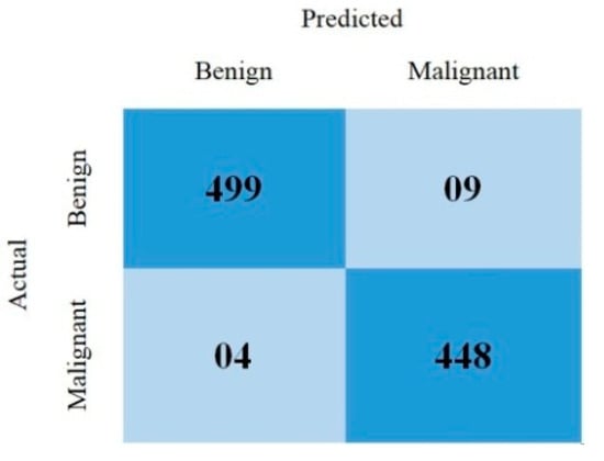 This section covered the outcomes as we put our work into practice by using a deep learning model involving U-Net architecture for segmentation, Inception-ResNet-2 for feature extraction, and a proposed Vision Transformer for classification. During feature extraction, hyperparameters are tuned until we find the best or optimum values, resulting in the best solution. We have trained our model on 15 epochs and attained an accuracy of 98.65%. The computational resources to train the proposed framework are NVIDIA GeForce RTX 3060 GPU, Intel(R) Core(TM) i7-10700KF CPU @ 3.80 GHz, 64.0 GB of RAM. After training, we plot a confusion matrix for the melanoma and benign skin lesions. True negative, false negative, true positive, and false positive are the foundation of the multi-label confusion matrix (MLCM) [39], which can be expressed as MLCM (0, 0), MLCM (1, 0), MLCM (1, 1), and MLCM (0, 1). In terms of the unique labels y_true and y_pred, multi-label confusion matrices are returned. A confusion matrix is shown for benign and melanoma in Figure 7, while Figure 8 represents the corresponding accuracy and loss of the model against epochs 11 to 15, respectively. The accuracy metric started from 86.03% when the number of epochs was 1, and as it grew, the accuracy increased to 98.65%. Furthermore, Figure 8 presents the model’s loss graph, which shows how badly the model was working. As at the early stage of the model, the number of epochs was lower and at epoch number 1, the loss was high. The proposed model was not doing well at epoch number 1, and while the number of epochs increased, the model’s loss went down and after epoch number 6, the loss decreased and the loss value was 0.3746. We trained our model on 15 epochs and at the 15th epoch, when our model achieved 98.65% accuracy, the loss value was 0.1556, represented by the proposed model’s performance. To mitigate overfitting and increase the efficiency of the trained model, we utilized regularization techniques and optimized hyperparameters to prevent overfitting by adding a penalty term to the model’s loss function. The graphical representation of classification performance in terms of accuracy, sensitivity, and specificity is provided in Figure 9.