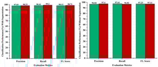 Performance analysis of proposed framework with and without segmentation process; green bar represents benign and red bar represents malignant classes.