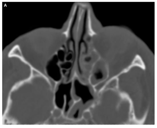 Two days after initial presentation, the patient exhibited incomplete ocular motor paresis, which progressively worsened over the next three days, finally leading to a complete left-sided opthalmoplegia with involvement of the oculomotorius (III), trochlear (IV), and abducens (VI) cranial nerves. Clinically, the patient had decreased visual acuity, and a fixed and dilated pupil on the left side. In the ophthalmological evaluation, the right eye was largely normal, with a visual acuity of 0.3, a clear cornea, regular eyelids, and no signs of retinal pathology. There was no relative afferent pupillary defect (RAPD), and ocular motility was unrestricted. Conversely, the left eye exhibited significant pathology, with pronounced swelling and redness extending across the nose and supraorbital region (as described in Figure 1). The conjunctiva was chemotic, the pupil was minimally reactive, and there was optic disc swelling with central retinal edema. CT imaging of the orbit and sinuses were performed (Figure 3). There was no imaging or clinical-endoscopic evidence to support an orbital complication arising from sinusitis, particularly ethmoiditis. The inflammatory-edematous swelling appeared to extend predominantly to the superficial layers of the eyelids and the frontal and temporal facial skin, rather than indicating a deeper orbital or sinus origin. Considering the patient’s history of antibody-negative autoimmune encephalitis two years before, there was suspicion of an IgG-associated autoimmune process. A follow-up consultation with the ophthalmology department led to the recommendation of corticosteroid therapy with 250 mg of prednisolone twice daily in addition to antibiotic treatment, and a clinical re-evaluation [5].