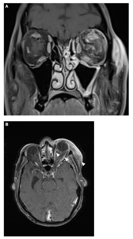 Under corticosteroid therapy, there was no improvement in the patient’s symptoms, particularly the local swelling, and the complete ophthalmoplegia persisted. Instead, following the initiation of corticosteroids, the patient developed additional neurological symptoms, including fluctuating episodes of aphasia as well as mild right-sided hemiparesis (National Institutes of Health Stroke Scale [NIHSS] 7 points) starting on day 3 of the treatment. Therefore, cerebral CT with CTA was repeated and showed no significant changes compared to the initial scan on the day of admission (as described in Figure 2A,B), except that the soft tissue swelling appeared to be more pronounced now. Additional cerebral magnetic resonance imaging (MRI) did not reveal any diffusion restrictions. Multiple small white matter lesions were identified bilaterally in the periventricular regions, likely indicative of chronic microangiopathic changes. Symmetrical calcifications in the thalami were consistent with findings from the previous CT scan. The MRI also confirmed the right temporal defect with ex vacuo dilation of the temporal horn. Regarding the local symptoms, venous dilation in the left superior ophthalmic vein was noted, along with significant phlegmonous enhancement at the apex of the left orbit, involving the left superior rectus muscle and potentially the optic nerve. Adjacent sinusitis was observed in the left frontal, ethmoid, sphenoid, and maxillary sinuses, accompanied by mild swelling of the left eyelid and inflammation of the adjacent subcutaneous tissue as well as contrast-enhanced protrusion of the left eye muscles (Figure 4).