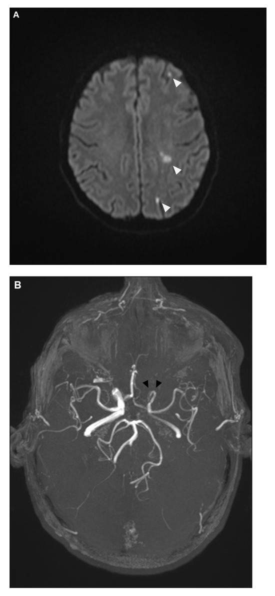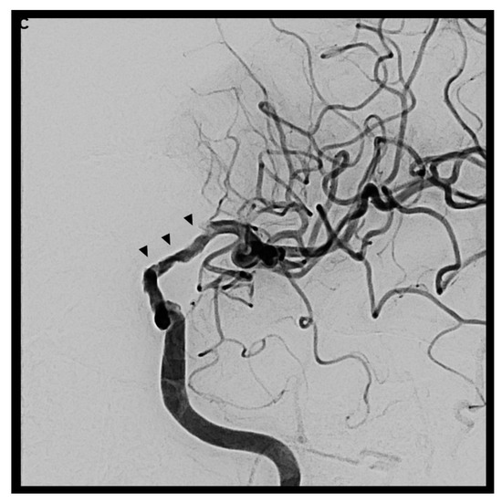 The patients experienced further clinical deterioration marked by decreased vigilance, worsening aphasia, and intensified right-sided hemiparesis, resulting in an NIHSS of 15 points. On day 7 after initial presentation at the first hospital (day 11 after symptom onset), the patient was transferred to our university clinic and admitted to our neurological intensive care unit (NICU). MRI was repeated, showing unchanged local inflammatory changes; however, new vessel abnormalities as well as diffusion restriction in the left middle cerebral artery territory were observed (Figure 5A,B). Based on these findings and the differential diagnosis of vasculitis or vasospasm, a digital subtraction angiography (DSA) was performed (Figure 5C).