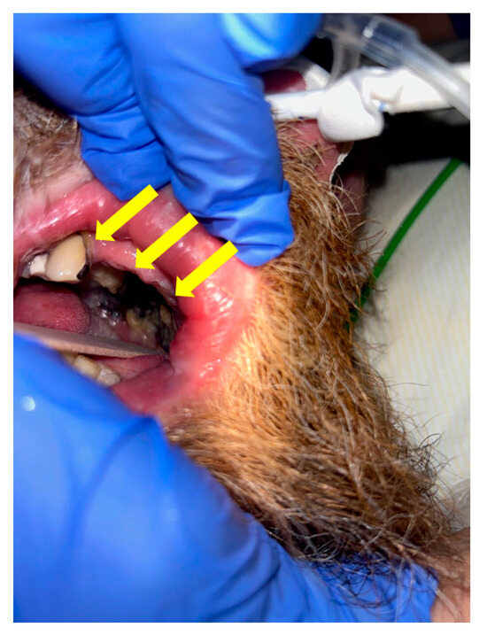 The image displays non-removable blackish-gray discolorations across the palate (yellow arrows), indicative of necrotic lesions that developed on day 9 after initial presentation and day 13 after symptom onset. These findings were suggestive of tissue invasion and necrosis consistent with an invasive fungal infection, likely mucormycosis. Due to these developments, Amphotericin B treatment was initiated.