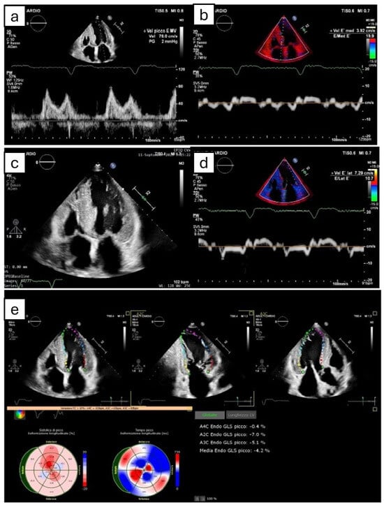 The figure shows the most common echocardiographic signs that can potentially suggest amyloidotic cardiomyopathy, even though none of them are pathognomonic. (a,b,d) Grade II diastolic dysfunction, with pseudonormal pattern at transmitral power Doppler (a) and reduced septal (b) and lateral (d) e’ velocity at tissue Doppler imaging. (c) Symmetric biventricular hypertrophy, with thickening of interatrial septum. (e) Apical sparing pattern derived by Speckle tracking echocardiography.