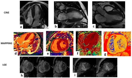 Case of a 63-year-old male that showed a hypertrophic left ventricle (LV) in the steady-state free-precession sequences (SSFP) in (a–c). The mapping sequences showed high values of T1 mapping (d,e), very high extracellular volume (f), and mild high value of T2 mapping (g). Late gadolinium enhancement sequences (LGE) (h,i) showed abnormal gadolinium kinetics with a faster washout of gadolinium from myocardium and blood pool and a transmural pattern in both ventricles. All these findings are suggestive for ATTR amyloidosis.