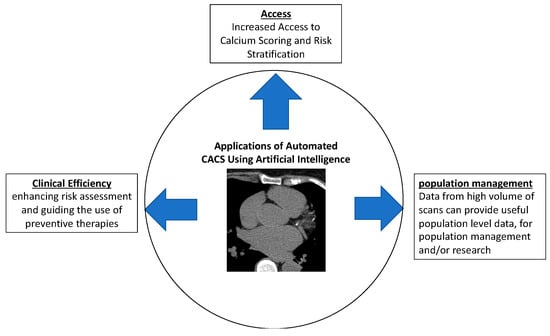 There are widespread applications of automated calcium scoring using artificial intelligence approaches. These include improved clinical efficiency to guide risk assessment and preventive therapy, increased access to calcium scoring, and increased population-level data from a high volume of scans to which the technology can be applied.
