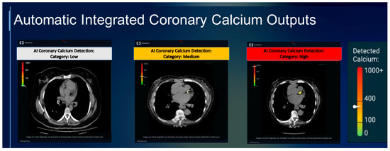 Examples of AI-based detection of CAC on non-contrast chest CT. The AI algorithm shown quantifies the coronary artery calcium (CAC) score and categorizes the amount of plaque as low, medium, or high. Figure courtesy of Nanox AI Ltd. (Petah Tikva, Israel).