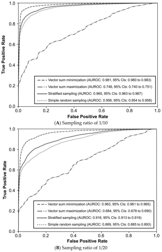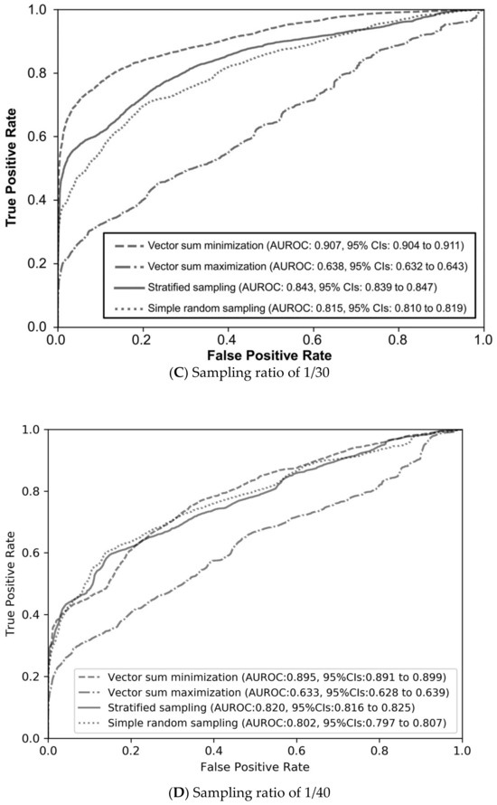 The predictive effects of each semantic text mining model built by the different training sets drawn in different sampling methods and ratios were shown as follows. At a sampling ratio of 1/10 (2766 data in training set and 24,635 in test set), the AUROC was highest in the sampling method of vector sum minimization, reaching 0.981 (95% confidence intervals (CIs): 0.980–0.983, p < 0.001). The second-highest AUROC was observed in stratified sampling at 0.965 (95% CIs: 0.963–0.967, p < 0.001), followed by simple random sampling at 0.956 (95% CIs: 0.954–0.958, p < 0.001), and the lowest AUROC was in vector sum maximization, registering 0.746 (95% CIs: 0.740–0.751, p < 0.001). (Figure 2A and Supplementary Table S1A). At a sampling ratio of 1/20 (1392 data in training set and 26,009 in test set), the AUROC remained highest in the vector sum minimization method at 0.963 (95% CIs: 0.961–0.965, p < 0.001). The other three methods ranked by AUROC values were stratified sampling, simple random sampling, and vector sum maximization. (Figure 2B and Supplementary Table S1B). At a sampling ratio of 1/30 (936 data in training set and 26,465 in test set) and 1/40 (706 data in training set and 26,695 in test set), the ranking of sampling methods by AUROC values maintained the same as in the previous two sampling ratios. (Figure 2C,D and Supplementary Table S1C,D).