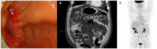Given the coexistence of colorectal cancer and IgG4-RD, the patient was noted to have elevated serum IgG4 levels (302 mg/dL; normal range, <135 mg/dL) on laboratory testing. The patient was administered adjuvant chemotherapy with folinic acid, fluorouracil, and oxaliplatin (FOLFOX) regimen for colorectal cancer and prednisolone (30 mg daily) for IgG4-RD. During prednisolone therapy, the patient’s serum IgG4 levels gradually decreased (302 to 51 mg/dL), and a follow-up PET-CT scan 1 year after surgery showed no evidence of local or distant recurrence of colorectal cancer. The patient is currently being closely followed-up with using surveillance imaging and laboratory tests.