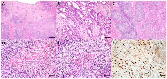 The patient underwent right hemicolectomy. The mass was grossly well-defined and yellowish tan, and the background colon was fibrotic. Microscopically, the tumor cells showed glandular differentiation with atypical nucleus and mitosis, confirming the presence of moderately differentiated adenocarcinoma invading the muscularis propria and pericolic adipose tissue in the transverse colon (Figure 2A,B). Moreover, there was dense lymphoplasmacytic infiltrate, obliterative phlebitis, and storiform fibrosis adjacent to and below adenocarcinoma in the resected colon specimen (Figure 2C–E). IgG4 immunostaining showed increased IgG4-positive plasma cells with an IgG4/IgG ratio of 60% in the colon specimen, supporting the diagnosis of IgG4-RD (Figure 2F).