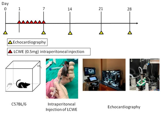 LCWE was prepared and injected into C57BL/6 mice intraperitoneally to induce vasculitis of KD. All mice underwent two-dimensional echocardiography of the coronary artery and high-resolution B-mode ultrasonography of the common carotid arteries. The mice were positioned in a supine orientation, as illustrated in the flow chart, and an ultrasonic coupling agent was applied to their chest wall. The left sternum was chosen for long- and short-axis evaluations using ultrasonography, employing a high-resolution small animal ultrasound system, as previously reported by Zhang et al. [7] The left main coronary artery (LCA) was measured midway between the ostium and the bifurcation of the circumflex artery and the left anterior descending coronary artery in the parasternal short-axis view. The same senior technician performed all high-resolution echocardiography detections of the mouse hearts. Animal echocardiography was performed by measuring the coronary artery dimensions, cardiac function, and carotid artery on days 0, 7, 14, 21, and 28 (high-resolution small animal ultrasound (Vevo 3100, FUJIFILM VisualSonics Inc. Toronto, ON, Canada). Z-scores were calculated with means and standard deviations from the data collection at day 0 by using regression with the square root of body surface area. Z-scores beyond the normal limits (cutoff of Z > 3.0) were considered abnormal.