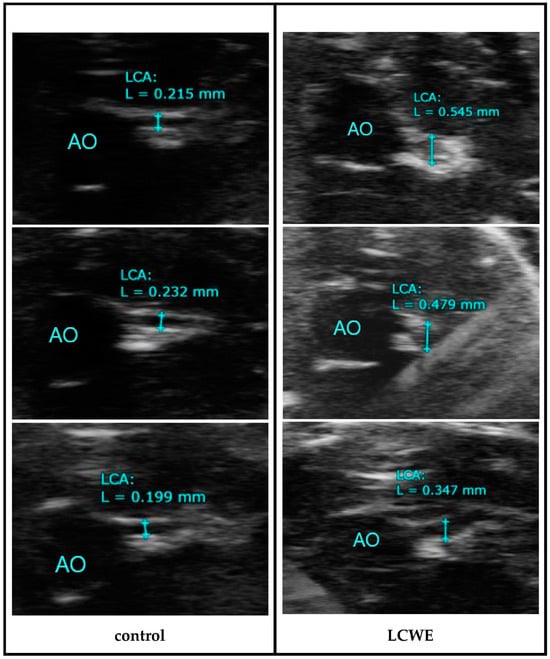Coronary artery diameter in the control group (no treatment) and LCWE group (intraperitoneal injection 2 mg/kg for 7 days) by echocardiography on day 28 after study (AO: aorta, LCA: left main coronary artery, L: diameter).